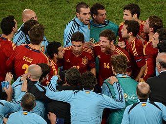 Сборная Испании по футболу стала первым финалистом чемпионата Европы 2012 года по футболу. Основное и дополнительное время полуфинального матча испанцев с командой Португалии закончилось вничью (0:0), а в серии послематчевых пенальти испанцы победили со счетом 4:2.